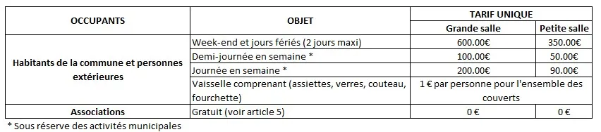 2. Pour la réservation, l’utilisateur devra remplir et signer le formulaire de contrat de location  fourni par la mairie  accompagné de 50% d’arrhes, puis signer le  règlement intérieur de la salle.